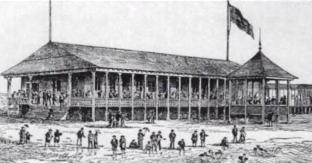 Norton and Murray’s Pavilion was located about a quarter of a mile southeast of the old steamboat pier, and was reached by a wide plank walk. The pavilion comprised three buildings, the largest containing about 700 bath houses. The center building was the pavilion proper, and contained a bar and restaurant. The third building was a small shanty bearing the sign “Coney Island Stock Exchange,” which contained an office of the Western Union Telegraph Company and tables for picnics.